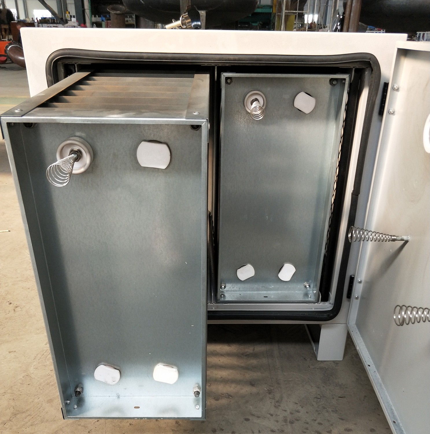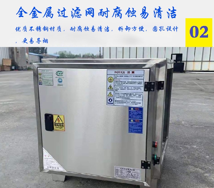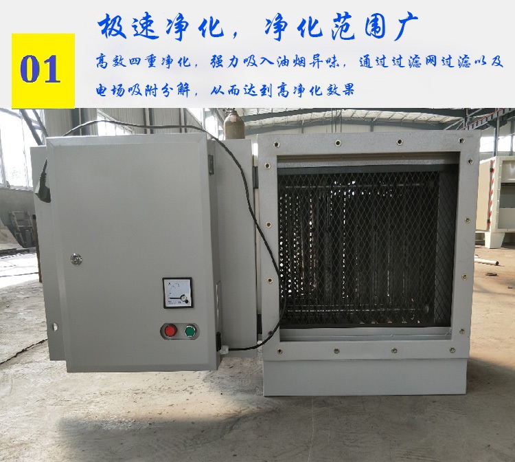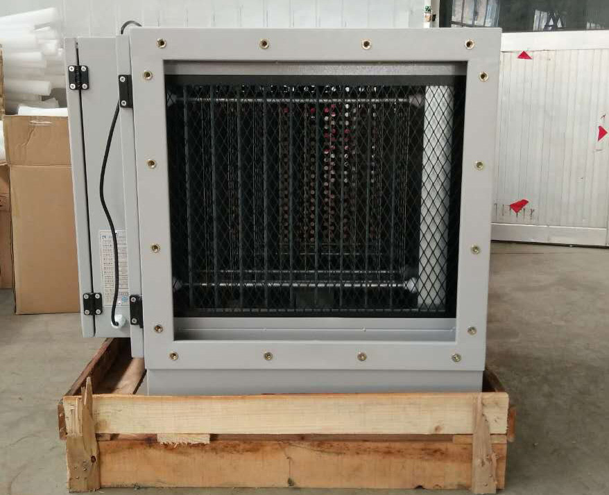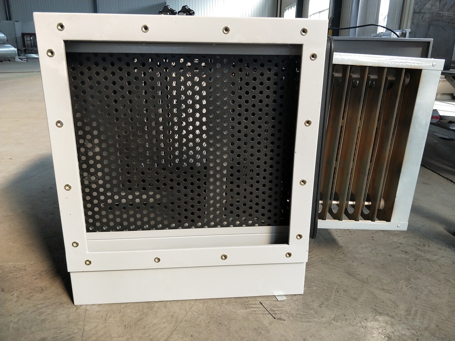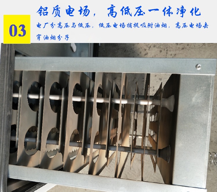 大顆粒油滴通過前擋板在自身重力作用下流入油槽排出。剩余的小粒徑污染物進(jìn)入離子高壓靜電區(qū),通過